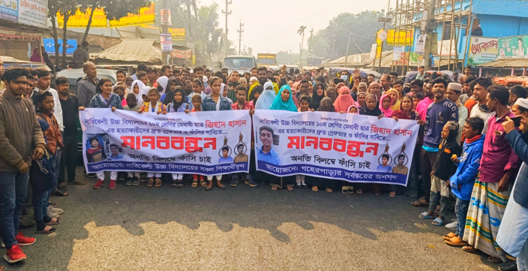 তারা অভিযোগ করেন, গত ৭ জানুয়ারি সন্ধ্যায় গহেরপাড়া পশ্চিমপাড়া এলাকায় জামে মসজিদের পেছনে জিহাদকে পরিকল্পিতভাবে ডেকে নিয়ে মারধর করা হয়। পরে ধারালো অস্ত্র দিয়ে কুপিয়ে তাকে হত্যা করা হয়। এ ঘটনায় দায়ের করা মামলায় একাধিক আসামির নাম থাকলেও পুলিশ এখনো সবাইকে গ্রেপ্তার করতে পারেনি বলে জানান বক্তারা।